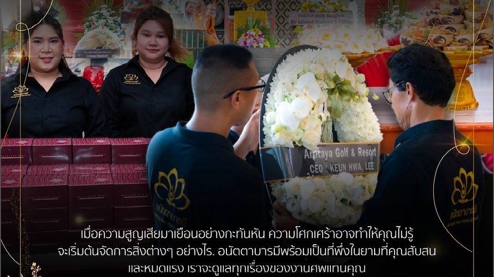 ให้บริการรับจัดงานศพแบบครบวงจร ด้วยความใส่ใจในทุกขั้นตอน เพื่อให้การอำลาครั้งสุดท้ายงดงาม สมเกียรติ และเป็นภาพจำที่ดีที่สุดของผู้วายชนม์และครอบครัว 🔹 การดูแลพิธีการ เจ้าหน้าที่ผู้เชี่ยวชาญให้คำปรึกษา วางแผน และประสานงานกับวัด/สถานที่ พิธีกร/ผู้นำพิธี ดูแลให้ทุกขั้นตอนเป็นไปอย่างสงบและราบรื่น 🔹 การจัดเตรียมสถานที่ การเคลื่อนย้ายร่างและโลงศพ การตกแต่งสถานที่ด้วยดอกไม้ พวงหรีด และอุปกรณ์พิธี ระบบแสง สี เสียง สำหรับงานที่ต้องการความสง่างามหรือทันสมัย 🔹 การจัดงานเลี้ยงและของที่ระลึก อาหารและเครื่องดื่มสำหรับแขก ของชำร่วย/ที่ระลึก (เลือกได้ทั้งแบบดั้งเดิมและแบบร่วมสมัย) 🔹 พิธีสำคัญ พิธีรดน้ำศพ พิธีสวดอภิธรรม (ปรับจำนวนวันได้ตามความต้องการ) พิธีฌาปนกิจ และเก็บอัฐิ พิธีลอยอังคาร เราเชื่อว่าการจากลาไม่ใช่แค่พิธีกรรม แต่คือการส่งต่อความรักและความทรงจำ ทีมงานพร้อมดูแลทุกรายละเอีย เพื่อให้ครอบครัวได้ใช้เวลาอยู่กับคนที่รักอย่างเต็มที่