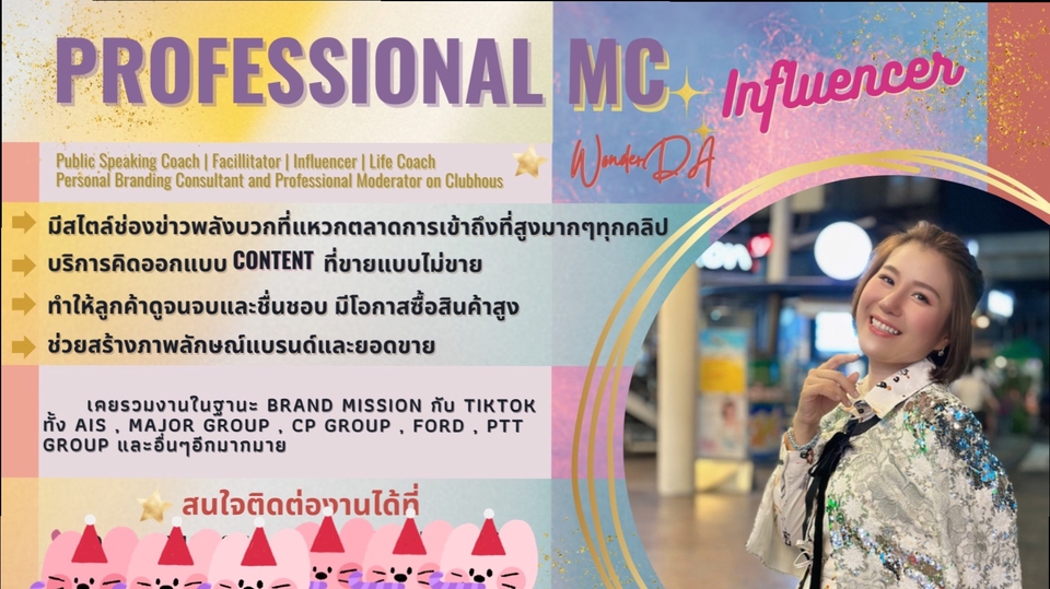สวัสดีค่าดา WonderDA story Influencer ยินดีร่วมงานมากๆ ค่ะ ขอโอกาสแนะนำตัวและฝากโปรไฟล์นะคะ🙏🏻 ถ่ายงานด้วย #iPhone15ProMax 256GB สี Titanium White ค่า💚🤍 ที่มีบริการคิดออกแบบ Content ที่ขายแบบไม่ขาย💖 มีสไตล์ช่องข่าวพลังบวกที่แหวกตลาดการเข้าถึงที่สูงมากๆทุกคลิป🎯 ทำให้ลูกค้าดูจนจบและชื่นชอบมีโอกาสซื้อสินค้าสูง🥰 ถ้าอยากให้ดาช่วยสร้างภาพลักษณ์แบรนด์และยอดขาย สามารถติดต่อร่วมงานกับดาได้เลยค่ะ🫶🏻 มาร่วมกันออกแบบชิ้นงานสุดปังไปด้วยกันค่ะ🎉 Professional MC | Public Speaking Coach Facillitator | Influencer | Life Coach | Personal Branding Consultant and Professional Moderator on Clubhouse🤗 👉🏻Influencer มืออาชีพใน Social Media ผู้ติดตามรวมกว่า 400,000 คน •เป็นครีเอเตอร์ที่ได้รับคัดเลือกจาก TikTok อย่างเป็นทางการในการเข้าร่วมงานอีเว้น และทุกกิจกรรมกับ TikTok •รวมงานในฐานะ Brand Mission กับ TikTok เช่น AIS , CP Group , Ford , Yamaha , PTT Group , Vitamilk , Bouncy Skin , บริษัทในเครือ Central , Major Group , SF Cinema , Ducthmilk , Sunsilk ,Mirinda , Vivo ,ฯลฯ พิชิตยอดวิวทุก Social Media กว่า 100 ล้านวิว🤩 💫ที่ปรึกษาสร้าง Personal Branding ให้ธุรกิจบน TikTok 💫วิทยากรสอนพูด สอนการสื่อสาร สอนสร้างรายได้บน TikTok 💫ที่ปรึกษา Content เพื่อสร้าง Brand ให้ลูกค้ามากมาย ขั้นตอนการทำงาน 1. คอนเฟิมงาน 2. รับบรีฟงานโดยละเอียด ภาพ วิดีโอ คอนเท้น 3. ส่งไอเดียสคริปต์ คอนเท้น 4. ส่งดราฟต์ 5. แก้ไขได้ไม่เกิน2ครั้ง 6. โพสต์งาน 7. โอนเงิน