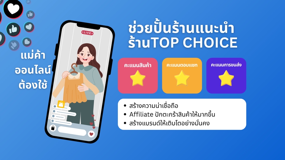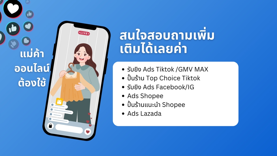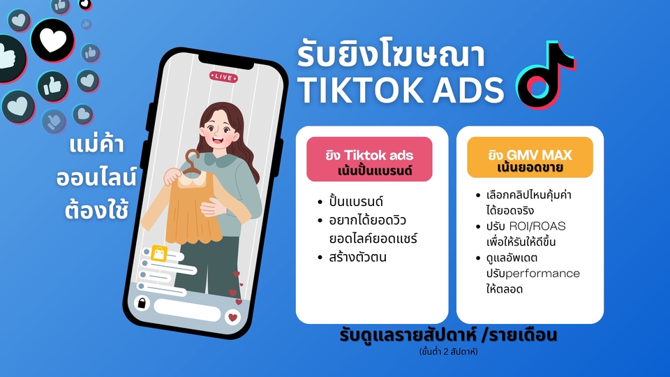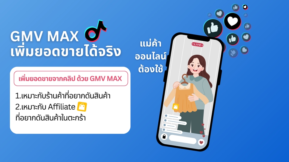 ยิงโฆษณา GMV MAX เพื่อเพิ่มยอดขายของร้าน เหมาะกับใคร - ร้านค้าออนไลน์ที่ต้องการดันสินค้า - นายหน้าที่ต้องการดันคลิปปักตะกร้า ยิง Tiktok Ads เพื่อปั้นแบรนด์ - เพิ่มยอดผู้ติดตาม - ยอดไลค์ ยอดวิว ยอดแชร์ ปั้นร้าน Top Choice Tiktok - เพิ่มความน่าเชื่อถือ - นายหน้าเอาสินค้าไปปักตะกร้าเยอะขึ้น - ร้านค้าถูกระบบดันให้เจอง่ายขึ้น