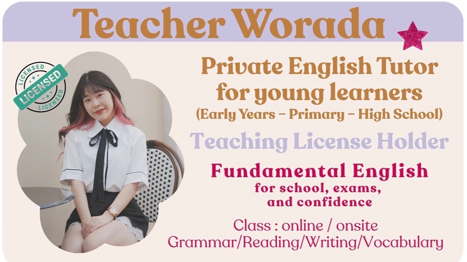 ครูมีประสบการณ์สอนเด็กเล็ก-มัธยม ทั้งในโรงเรียนและคลาสส่วนตัว *มีใบประกอบวิชาชีพ* สามารถดำเนินการสอนได้ทั้งภาษาไทยและอังกฤษ เข้าใจธรรมชาติและเข้ากับเด็กได้เป็นอย่างดีค่ะ - ปูพื้นฐาน / เนื้อหาของโรงเรียน / สอบ / เสริมความรู้นอกห้องเรียนในทุกทักษะ ( Grammar, Vocabulary, Speaking, Phonics และ Reading ) - ปรับเนื้อหาและวิธีสอนให้เหมาะกับบุคลิกของผู้เรียนแต่ละคน สร้างความมั่นใจให้เด็กกล้าพูด กล้าใช้ภาษาในชีวิตจริง - ครูเน้นความสัมพันธ์ที่ดีระหว่างครู-นักเรียนด้วยค่ะ พร้อมพูดคุย ให้กำลังใจ นักเรียนจะไม่เครียดและไม่กลัวภาษาอังกฤษ รูปแบบการเรียน : ปรับเวลาเรียนได้ตามสะดวก - Online : อยู่ที่ไหน จังหวัดไหนก็เรียนได้ - Onsite : พื้นที่ กทม.ตามแนวรถไฟฟ้า หรือเขต ราชพฤกษ์, ตลิ่งชัน, ปิ่นเกล้า, พระราม 2 คิดค่าบริการเพิ่ม 100 บาท/ ครั้ง
