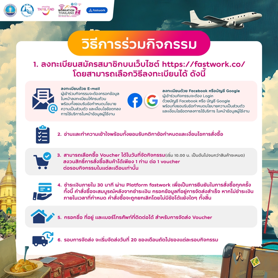 กิจกรรมส่งเสริมการขาย Workation 100 เดียวเที่ยวได้งาน เป็นกิจกรรมที่ตอบโจทย์ไลฟ์สไตล์ของคนทำงานยุคใหม่ ที่ต้องการความยืดหยุ่นทั้งในเรื่องเวลาและสถานที่ พร้อมเปิดประสบการณ์การทำงานจากแหล่งท่องเที่ยวทั่วไทย ด้วย Voucher ท่องเที่ยว ราคาเพียง 100 บาท ก็สามารถเข้าถึงบริการและประสบการณ์ระดับพรีเมียม ไม่ว่าจะเป็นโแรมที่พัก ร้านอาหารและกิจกรรมด้านการท่องเที่ยว จากผู้ประกอบการชั้นนำมากมาย