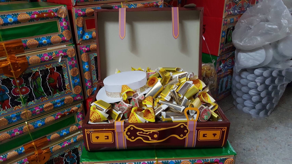 ฿950ชุดหีบเสื้อผ้า ภายในจะมีเสื้อผ้า 6 ชุด แบงค์ ใบผ่านทาง รองเท้า - ค้อซึ 1 ก้อน กระดาษเงินกระดาษ 2 ก้อน ใบผ่านทาง 1 ก้อน แบงค์ใหญ่ 1 ก้อน พับแล้ว และทองแท่ง 3 ก้อน - ชุดธุปเที่ยน น้ำมัน กระทงค้อซี ที่ใช้บูชาหลวงปู่ไต้ฮงกง เพื่อทำการฝากห่อเสื้อผ้าไปยังบรรพบุรุษที่เราต้องการฝากไปให้ - ทางเราจะถ่ายภาพ หรือวิดีโอ ส่งให้กับลูกค้าเพื่อยืนยันว่า ทางเราได้ทำพิธีฝากเครื่องกระดาษเหล่านี้ให้แก่บุคคลที่ลูกค้าต้องการฝากส่งไปให้จริง