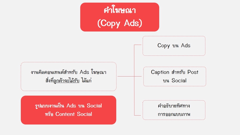 ออกแบบเนื้อหาสำหรับสร้างภาพนิ่งเพื่อโพสต์ผ่าน Social Network ส่งไฟล์เป็น Power Point รายละเอียดงาน >> คิด Copy + คอนเซปต์ภาพ (ไม่ทำภาพ) + caption 1 โพสต์ = 350 บาท 5 โพสต์ = 500 บาท **ลูกค้าต้องเอาสิ่งที่เสนอไปให้กราฟฟิกดีไซน์เนอร์ทำภาพอีกครั้ง** ---------------------------------------------------------------------------------- หากต้องการภาพด้วย คิดเพิ่มภาพละ 500 บาท ---------------------------------------------------------------------------------- พิเศษ จ้างเป็น Set 10 ภาพ 10 คอนเทนต์ ราคา 4,800 บาท ขั้นตอนการทำงาน 1. ลูกค้าสอบถาม + ฟรีแลนซ์อธิบายรายละเอียด + ส่งตัวอย่างให้ลูกค้าดู (หากลูกค้าต้องการ) 2. ลูกค้าบรีฟงาน 3. เริ่มทำงาน 4. ส่งงานให้ลูกค้าตรวจ 5. แก้ไข (หากมี) 6. ส่งงานครั้งสุดท้าย