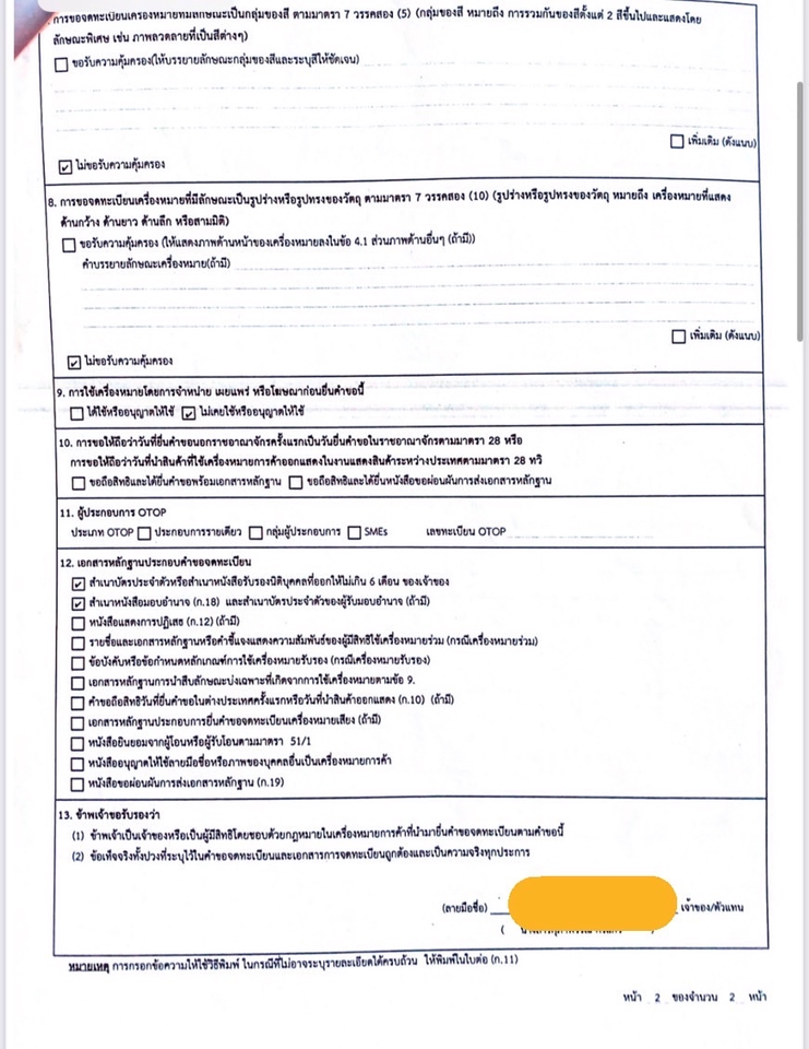 สิ่งที่ลูกค้าต้องเตรียม -รูปโลโก้ของคุณ ขนาดไม่เกิน 5*5 ซม. 1 รูป (ถ้าในโลโก้ของคุณมีตัวอักษรต่างประเทศโปรดเขียนคำอ่านและคำแปลให้ผมด้วย) -รายการสินค้าทั้งหมดมีอะไรบ้าง (ตัวอย่าง ถ้าขายเสื้อผ้า ก็จะเป็น เสื้อ,กางเกง แต่ถ้าเป็นร้านอาหาร ก็จะเป็น จัดจำหน่ายอาหารและเครื่องดื่ม เป็นต้น) -สำเนาบัตรประชาชน พร้อมเซ็นต์รับรองสำเนา(กรณีจดในนามบุคคลธรรมดา) -สำเนาหนังสือรับรองนิติบุคคล ออกไม่เกิน 6 เดือน พร้อมเซ็นต์รับรองและประทับตราบริษัททุกหน้า (กรณีจดในนามบริษัท) หมายเหตุ " ค่าธรรมเนียมการยื่นจดลูกค้าเป็นผู้จ่าย ราคาค่าใช้จ่ายตามประกาศกรมทรัพย์สินทางปัญญา " ขั้นตอนการทำงาน 1. ตรวจสอบเครื่องหมายการค้า 2. ยื่นจดทะเบียนเครื่องหมายการค้า 3. ติดตามสถานะ หลังยื่นจดทะเบียน 4. ได้รับใบสำคัญการจดทะเบียนเครื่องหมายการค้าหลังจากยื่นจดทะเบียนแล้ว กรมทรัพย์สินทางปัญญาจะออกหนังสือสำคัญการจดทะเบียนภายในระยะเวลา 12-14 เดือน หลังจากวันที่ยื่นจดทะเบียนเครื่องหมายการค้า