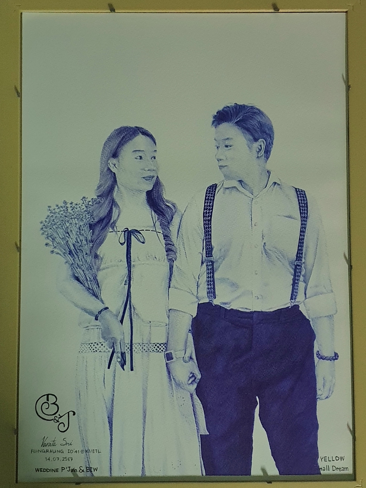 ภาพ Portrait เป็นภาพวาดเหมือนกับบุคคลต่างๆ ด้วยเทคนิค Stroke line : ปากกาต่างๆ (สีน้ำเงิน/สีดำ/สีแดง) ในการวาดรูปภาพเหมือนต่างๆลงในกระดาษร้อยปอนด์ รูปที่อยู่ในขนาดกระดาษต่างๆ ไม่ควรเกิน 3 คน ทั้งนี้ขึ้นอยู่กับขนาดของกระดาษด้วยนะคะ ขั้นตอนการทำงาน 1. ตัดกระดาษ 100 ปอนด์ให้ได้ขนาดที่กำหนด 2. วาดลายที่ต้องการลงบนกระดาษ 100 ปอนด์ที่เตรียมไว้แล้วด้วยปากกาลูกลื่น 3. ใส่กรอบ (ถ้ามี) 4. จัดส่งตามที่อยู่จัดส่งลูกค้า