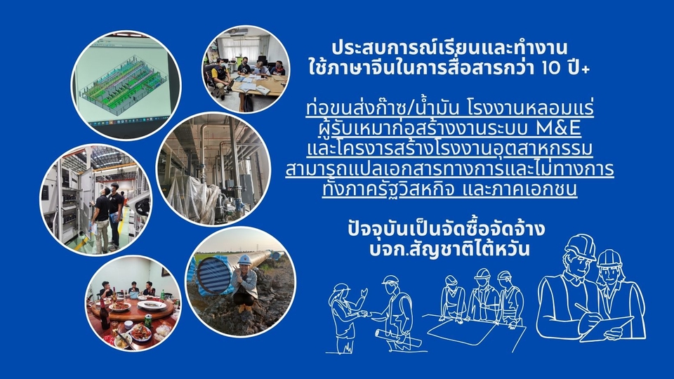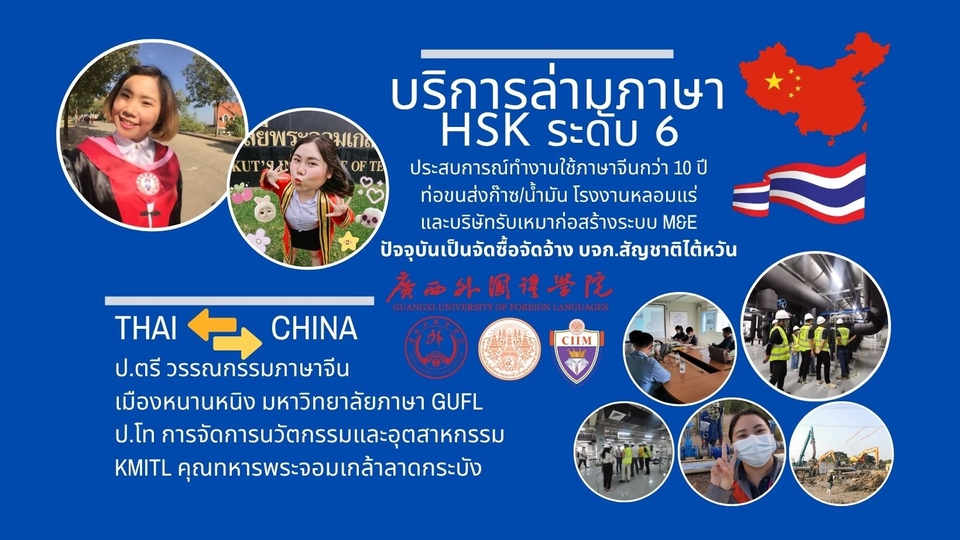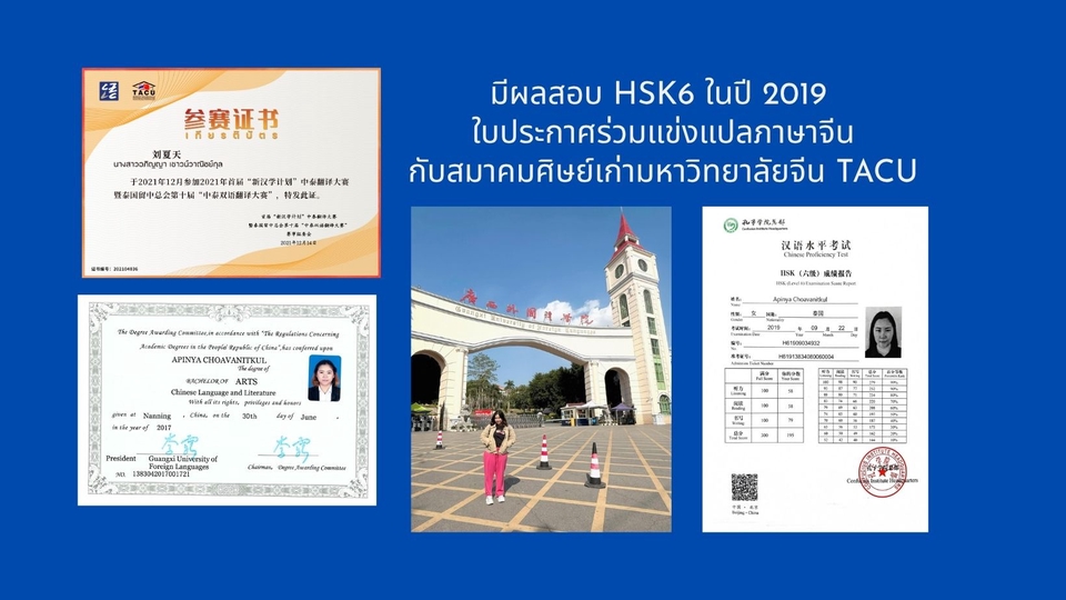 ป.ตรี วรรณกรรมภาษาจีน มหาวิทยาลัยต่างประเทศ GUFL ป.โท การจัดการนวัตกรรมและอุตสาหกรรม เจ้าคุณทหารลาดกระบัง มีประสบการณ์เรียน-ทำงานร่วมกับ บจก.สัญชาติจีน-ไต้หวัน กว่า10ปี+ ใช้ภาษาจีนในการสื่อสารติดต่องาน 100% ประสบการณ์ทำงานก่อสร้างวางท่อก๊าซและน้ำมัน โรงงานหลอมแร่ธรรมชาติ ผู้รับเหมาก่อสร้างระบบ M&E และโครงสร้างโรงงานอุตสาหกรรม สามารถแปลเอกสารภาครัฐ รัฐวิสาหกิจ หรือเอกชนได้ ผ่านการสอบ HSK6