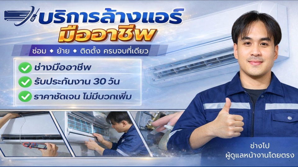 บริการล้างแอร์โดยช่างมืออาชีพ เน้นงานคุณภาพ ไม่รีบ ไม่ลวกงาน ทุกเครื่องตรวจเช็คก่อน–หลังล้าง เพื่อให้ลูกค้ามั่นใจว่าแอร์สะอาดและทำงานได้เต็มประสิทธิภาพจริง 🔍 เราแตกต่างจากช่างทั่วไปอย่างไร • ล้างตามขั้นตอน ไม่ใช่แค่ฉีดน้ำผ่าน • ตรวจเช็คสภาพแอร์จริงก่อนเริ่มงาน • แจ้งปัญหาตามจริง ไม่ขายงานเกินจำเป็น • ทำงานสะอาด เก็บงานเรียบร้อย ไม่ทิ้งคราบ 🛠 บริการที่ได้รับ • ล้างคอยล์เย็น คอยล์ร้อน อย่างละเอียด • ล้างแผ่นกรองอากาศ • เป่าทำความสะอาดฝุ่น คราบสะสม • ตรวจเช็คระบบการทำงานเบื้องต้น ✅ ความมั่นใจที่ลูกค้าได้รับ • ช่างมืออาชีพ ประสบการณ์ตรง • ราคาชัดเจน ไม่มีบวกเพิ่มหน้างาน • รับประกันงานล้าง 30 วัน • แอร์เย็นขึ้น ลมแรงขึ้น เห็นผลจริง เหมาะสำหรับบ้าน คอนโด และออฟฟิศ เน้นงานคุณภาพ สำหรับลูกค้าที่ต้องการช่างที่ “ดูแลแอร์จริง ๆ ไม่ใช่แค่ล้างผ่านครับ”
