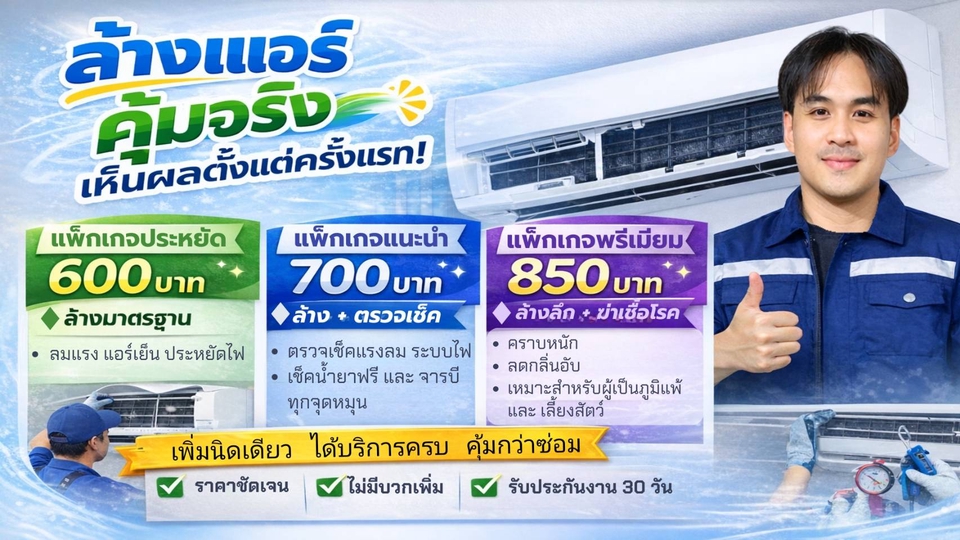 🛠 รับงานแอร์ครบวงจร – ล้าง ติดตั้ง ซ่อม เติมน้ำยา 💧 ล้างแอร์แบบเปิดฝาถอดล้าง สะอาดถึงแผงคอยล์ 🔍 ตรวจเช็คก่อน-หลัง ทำงานโปร่งใส ราคาเป็นกันเอง 📍 รับงาน กรุงเทพฯ และปริมณฑล (ระบุพื้นที่ที่รับ) พร้อมออกใบเสนอราคา/ประเมินหน้างาน ไม่มีเรียกเก็บเพิ่มเติม
