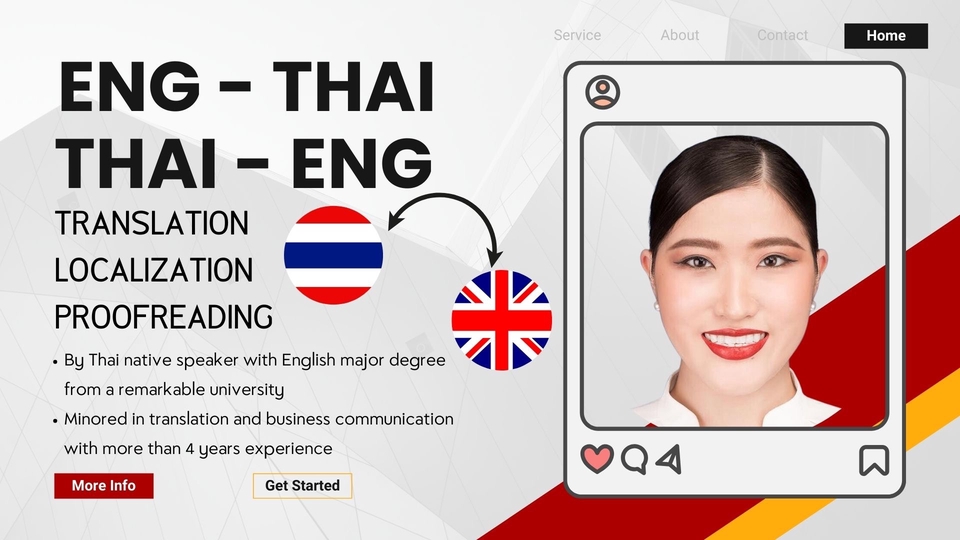 จบป.ตรี เอกภาษาอังกฤษ มหาวิทยาลัยเกษตรศาสตร์บางเขนด้วยผลคะแนนสอบเข้าเป็นอันดับที่สองของคณะ โดยเรียนวิชาโทด้สนการแปลโดยเฉพาะ และยังเรียนควบคู่กับวิชาโทการสื่อสารธุรกิจอีกด้วย มีประสบการณ์การทำงานแปลมายาวนานกว่า 4 ปี และเคยแปลภาษาให้กับบริษัท Shera Company และ Thai AirAsia มีผลคะแนนสอบ TOEIC อยู่ที่ 955/990 และถนัดการแปลเอกสารราชการทุกประเภท พร้อมจัดฟอร์มให้ใช้งานได้จริงทันที ขั้นตอนการทำงาน 1. ส่งงานที่ต้องการแปลให้ประเมินราคา 2. ยืนยันการเริ่มทำงาน 3. ตรวจสอบงานแปลที่ได้รับ 4. ยืนยันงานที่ได้รับและชำระราคา