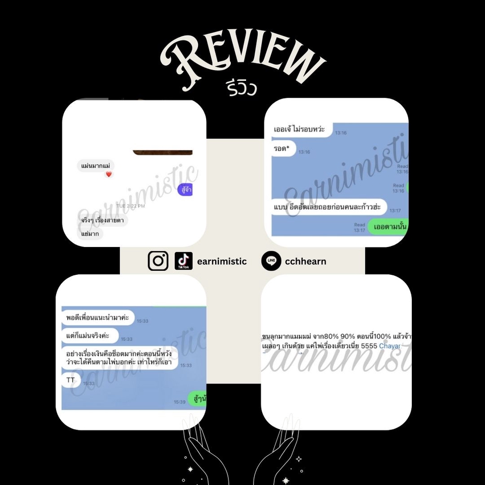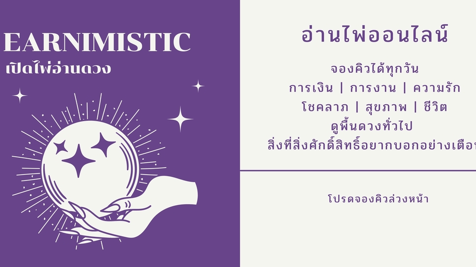 Earnimistic เป็นชื่อที่จดจำกันในวงการดูดวง ทางเรารับเปิดไพ่ทายใจ ทุกเรื่องไม่ว่าจะเป็น การงาน การเงิน ความรัก ชีวิต สุขภาพ โชคลาภ ฯลฯ โดยแม่หมอจะเลือกไพ่ในสต็อกที่มีอยู่ตามวัตถุประสงค์ที่ต่างกันออกไปของลูกดวง สามารถให้คำปรึกษาและตอบคำถามที่ค้างคาใจได้เสมอเพียงแค่ทักมาหากัน ขั้นตอนการทำงาน 1. แจ้งนัดวันเวลาที่สะดวกดูดวง 2. เลือกแพ็คเกจที่ท่านสนใจ 3. รับคำทำนาย