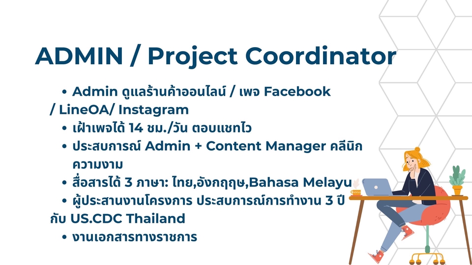 รับงานแอดมินออนไลน์ ตอบแชท ดูแลเพจ facebook/instagram/lineOA Content manager งานผู้ประสานงาน งานเอกสารทางราชการ(ร่าง+ตรวจสอบความถูกต้อง ทั้งภาษาไทยและภาษาอังกฤษ ขั้นตอนการทำงาน 1. ติดต่อรับบรีฟ 2. รันงาน 3. Rechek