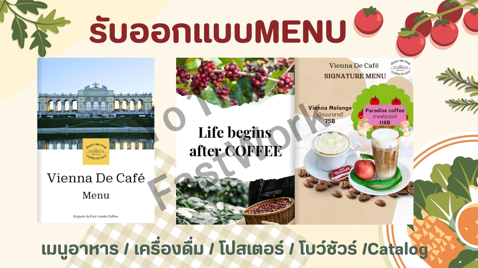 รับออกแบบเมนูอาหาร / เครื่องดื่ม / โปสเตอร์ / โบว์ชัวร์ ตามความเหมาะสมในแต่ล่ะธุรกิจ แก้งานได้ทั้งหมด 3 ครั้ง หากแก้งานเพิ่มคิดครั้งล่ะ1,000฿ ขั้นตอนการทำงาน 1. ลูกค้าทักข้อความผ่านFast work 2. ปรึกษารายละเอียดเกี่ยวกับงาน 3. ลูกค้าเลือกPackage 4. ชำระเงินผ่านFast work 5. ส่งมอบงานให้กับลูกค้าตรวจสอบผ่านE-book 6. ลูกค้าอนุมัติงาน และส่งมอบงาน(ไม่ติดลายน้ำ) ผ่านGoogle Drive