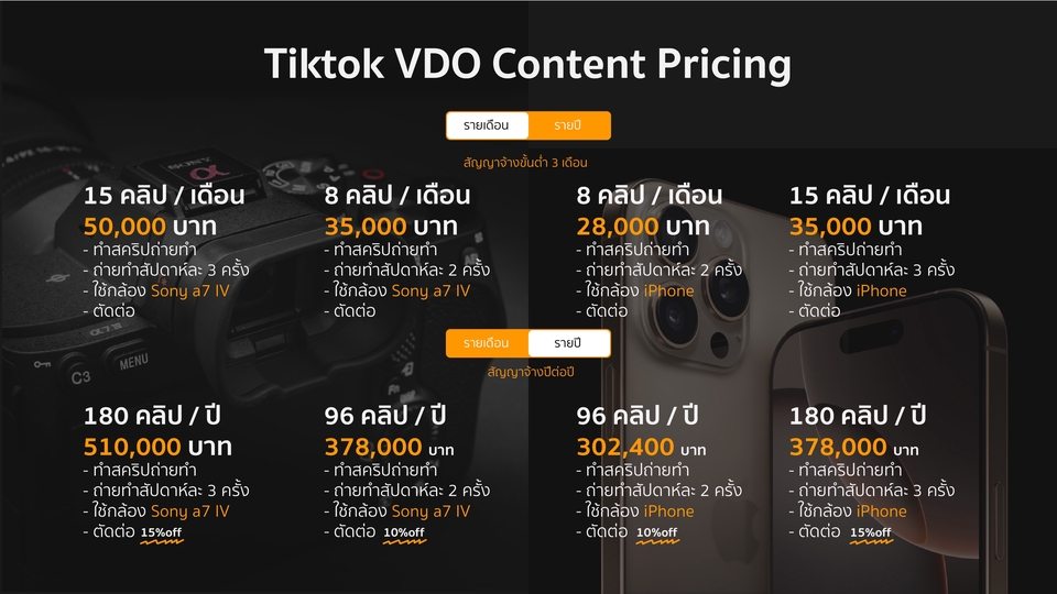 กล้อง Sony Fx3 หรือ Sony α7R IV + Drone ออกกองถ่าย 2 ครั้ง จำนวน 15-30 คลิปต่อเดือน Create Content พร้อมพากย์เสียง สัญญาเริ่มต้น 3 เดือน ***กรณีถ่ายในกทม ไม่คิดค่าเดินทาง ถ่ายต่างจังหวัดคิดค่าเดินทางเพิ่มเติมตามจริง ขั้นตอนการทำงาน 1. รับบรีฟ และข้อมูล สินค้า/บริการ 2. นำเสนอ Script 3. นัดวันถ่ายทำ 4. ตัดต่อและส่งมอบงาน