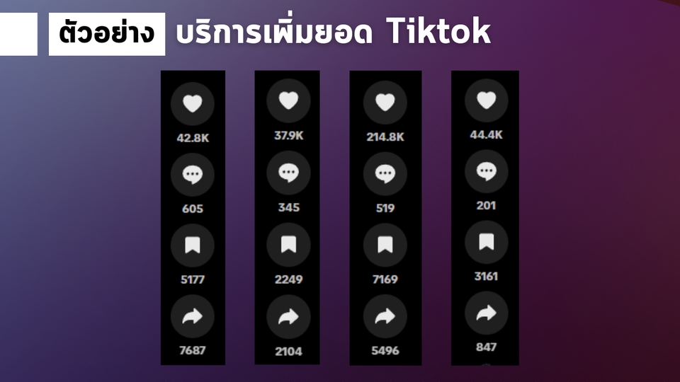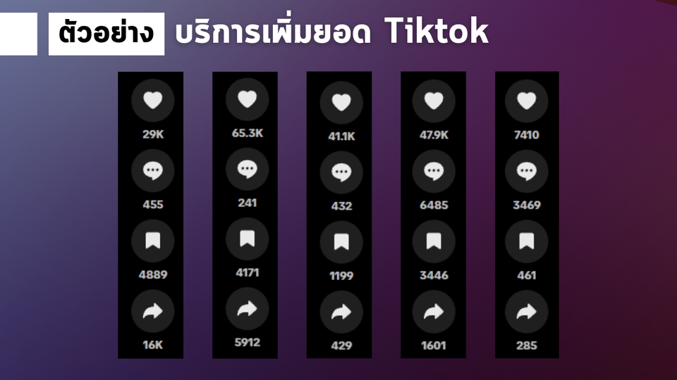 ฿50030,000 วิว + 3,000 ใจ + 100 เซฟ + 300 แชร์ = 500฿ 50,000 วิว + 5,000 ใจ + 300 เซฟ + 500 แชร์ = 650฿ 100,000 วิว + 10,000 ใจ + 500 เซฟ + 700 แชร์ = 1150฿