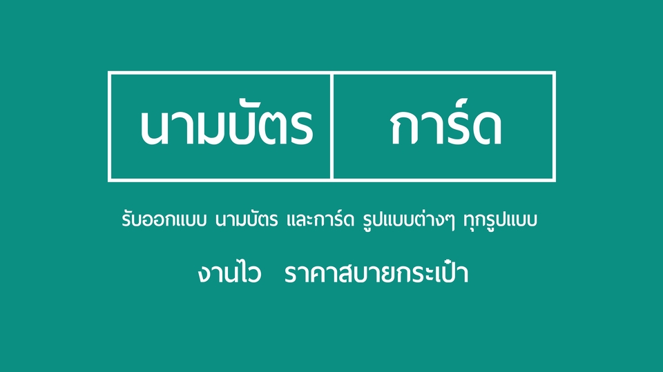 ออกแบบ นามบัตร, การ์ด งานไว ราคาสบายกระเป๋า ใส่ใจในรายละเอียดของงานลูกค้า ทักมาปรึกษาก่อนได้นะครับ รายละเอียดราคาเพิ่มเติม รับออกแบบ นามบัตร, การ์ดงานแต่ง, การ์ดงานบวช, เมนูอาหาร และอื่นๆ ทุกรูปแบบ ใช้โปรแกม Ai, Ps ในการออกแบบ ได้ทุกไลฟ์สไตล์ (คุยกันได้ครับ) การทำงานในข้างต้นลูกค้าจะได้รับไฟล์ JPG หรือ PNG ที่ใช้สำหรับลงในสื่อนั้น ๆ ที่ลูกค้ากำหนดไว้ ถ้าลูกค้าต้องการงงานที่ลงในสื่อต่าง ๆ แต่มีขนาดเดียวกันไม่ต้องรีไซส์เราสามารถทำให้ลูกค้าได้ "ฟรี" แต่ถ้ามีการรีไซส์ในขนาดต่าง ๆ มีค่าใช้จ่ายเพิ่มอยู่ที่ความเหมาะสมครับ (ถ้าต้องการไฟล์ Ps หรือ Ai ขออนุญาติเพิ่มเงิน 200 บาท/ไฟล์ นะครับ) ขั้นตอนการทำงาน 1. - แจ้งรายละเอียดงาน เนิ้อหา และรูปแบบที่ต้องการ หากมีรูปแบบในใจสามารถส่งมาได้ เพื่อความรวดเร็วในการออกแบบ (แต่ถ้าหากคิดไม่ออก ยินดีออกแบบให้ได้ครับ) 2. - สรุปเนื้อหางาน ประเมินราคา 3. - เริ่มต้นทำงานโดยใช้ระยะเวลาในการทำ 3 วัน อาจจะเร็วหรือช้ากว่านี้ (อยู่ที่เนื้องาน) 4. - ส่งชิ้นงานให้ตรวจสอบความถูกต้อง สามารถแก้ไขงานได้ 2 ครั้ง 5. - เมื่อเรียบร้อยแล้ว ส่งมอบเป็นไฟล์ภาพ JPEG หรือ PNG หากคุณลูกค้าต้องการไฟล์ Ai(ไฟล์ต้นฉบับ) ขออนุญาตคิดค่าไฟล์เพิ่มนะครับ
