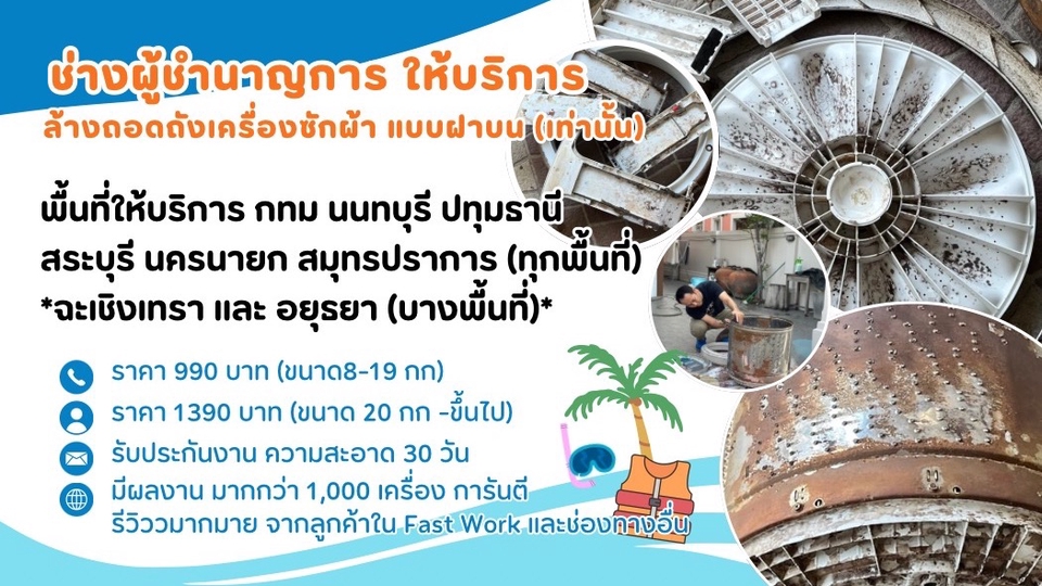 บริการ ล้างถังเครื่องซักผ้า เฉพาะฝาบน ทุกแบรนด์ ทุกรุ่น โดย ช่างผู้ชำนาญการ ( มีประสบการณ์ ทำงาน มากกว่า 1,000 เครื่อง ) -ให้บริการ พื้นที่ กทม นนทบุรี ปทุมธานี สระบุรี นครนายก (ทุกพื้นที่ ) -ประกันงาน 30 วัน ( ในเรื่อง ความสะอาด ) ** หากเครื่องซักผ้าขัดข้องเพราะสาเหตุจากการล้างเครื่องซักผ้า ช่างจะแก้ให้สามารถใช้งานได้เหมือนเดิม ในวันทำงานจนจบ เพื่อให้ ผู้ว่าจ้าง ไม่ต้องกังวล ในการใช้งาน **