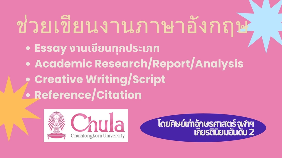 รับเขียนบทความภาษาอังกฤษโดยฟรีแลนซ์ที่มีความชำนาญ มีความคุ้นเคยกับภาษาอังกฤษเป็นอย่างดีเพราะเคยใช้ชีวิตอยู่ที่ต่าฃประเทศในวัยเด็ก และจบการศึกษาโรงเรียนนานาชาติ มีคะแนนสอบ IELTS ที่ 7.5 โดยไม่ผ่านการติวหรือเรียนพิเศษ จบคณะอักษรศาสตร์ หลักสูตรนานาชาติ จุฬาลงกรณ์มหาวิทยาลัย และมีประสบการณ์เป็นนักเรียนแลกเปลี่ยนที่ University of Western Australia ประเทศออสเตรเลีย และ University of New Brunswick ประเทศแคนาดา เริ่มรับเขียนบทความและงานภาษาอังกฤษมาเป็นระยะเวลากว่า 3 ปี และมีผลงานมาแล้วมากกว่า 700 ขั้นตอนการทำงาน 1. คุยรายละเอียดและตกลงราคา 2. ดำเนินงาน 3. ส่งงาน 4. แจ้งแก้ไข (ถ้ามี) 5. ส่งงานครั้งสุดท้าย