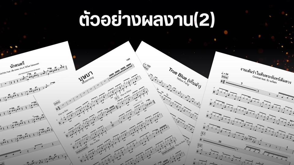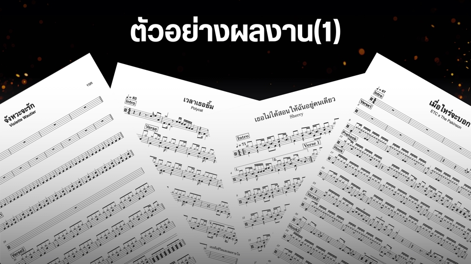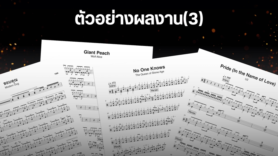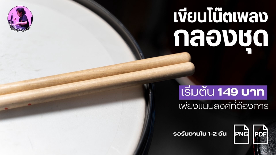 รับเขียนโน๊ตกลองชุด ไม่จำกัดแนว ขอเพียงแค่ลูกค้าส่งลิงค์ youtube ของเพลงที่ต้องการแกะมา ทางเราจะทำการประเมินความยาก - ง่ายของเพลง และทำการตกลงราคากับลูกค้าก่อนที่จะเริ่มงาน เมื่อได้ยอดแล้ว เรียนลูกค้าชำระเงินก่อนเริ่มทำงาน โดยทางลูกค้าจะได้รับงานกลับไปภายใน 2-3 วัน ทางเราจะส่งงานให้เป็นไฟล์ PDF และ PNG หรือถ้าหากต้องการเป็นไฟล์ใด ก็สามารถแจ้งได้เลยครับ : ) ขั้นตอนการทำงาน 1. ลูกค้าส่ง Link เพลงที่ต้องการมา พร้อมบอกความต้องการ(เสียงกลองต้องชัด) 2. เมื่อคุยรายละเอียดงานที่ต้องการมาเรียบร้อย ลูกค้าจะต้องชำระเงินก่อนเริ่มงาน 3. ทางเรานจะเริ่มลงมือทำงานทันที 4. หลังจากเขียนโน๊ตเสร็จแล้ว ทางเราจะ export งานให้ลูกค้าตรวจทาน 5. หากต้องการให้แก้ไขตรงไหน สามารถแจ้งเราได้เลย เราจะทำตามคำขอ แต่หากพอใจแล้ว เราจะทำการส่งโน๊ตนามสกุล .png, .pdf ให้ท่าน แล้วถือเป็นอันจบงาน
