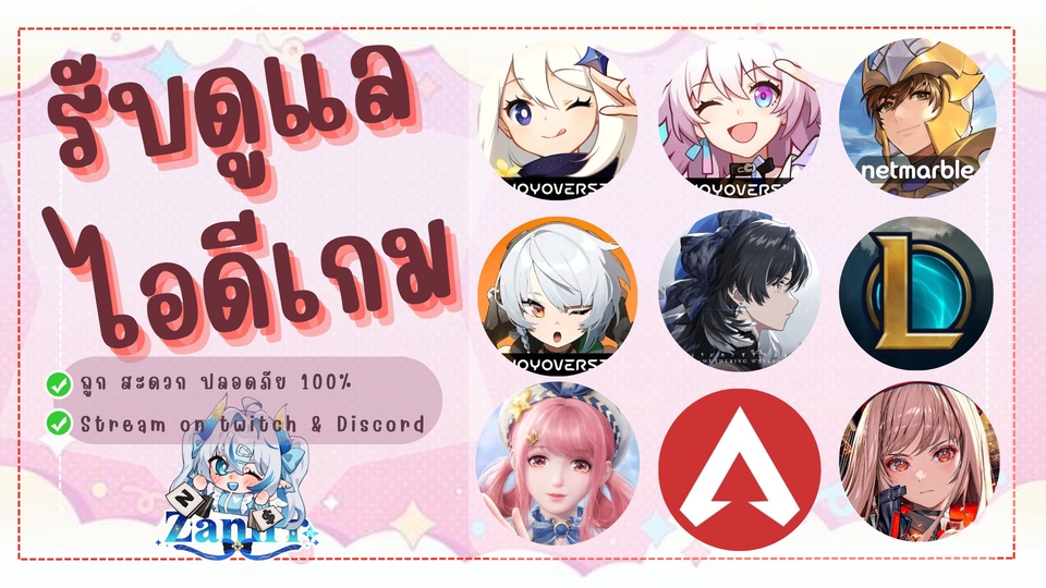 🎮 สวัสดีค่ะ! Zanirr — Vtuber / Streamer บน Twitch 💙 ให้บริการเพื่อความสบายใจและปลอดภัยของคุณ ✨ 🔹 สามารถ สตรีมผ่าน Discord ให้ดูได้แบบเรียลไทม์ เพื่อให้คุณมั่นใจในทุกขั้นตอนการทำงาน บริการของเรา: 🎮 รับดูแลไอดีเกม / เล่นเกมแทน 💬 เล่นเกมเป็นเพื่อน แก้เหงา สนุกไปด้วยกัน 🎨 รับวาดภาพ / ภาพโปรไฟล์ / คอนเซ็ปต์อาร์ต 🕹️ เล่นได้หลายเกมมาก (ยกเว้น Valorant) สอบถามเพิ่มเติมได้ทุกเมื่อค่ะ 💙