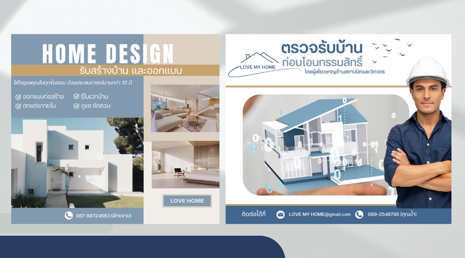 ออกแบบแบนเนอร์เกี่ยวกับบ้าน เช่น รับสร้างบ้าน ขายบ้าน บริษัทตรวจบ้าน คำแนะนำก่อนเริ่มงานลูกค้าควรเตรียมข้อมูล ดังนี้ 1.บรีฟ (ความต้องการ สี ไสตล์รูปแบบ) 2.สินค้่า (รูปสินค้าที่ต้องการ , โลโก้แบรนด์) **ขอไฟล์แบบละเอียด คมชัด 3.คำโฆษณา (สำหรับใส่ในภาพ เนื้อหาต่างๆ) ขั้นตอนการทำงาน 1. คุยรายละเอียดงานหรือสอบถามข้อมูลเบื่้องต้น 2. ลูกค้าบรีฟรายละเอียดต่างๆที่ต้องการ เช่น เรียบหรู มินิมอล น่ารัก ฯลฯ โทนสีต่างๆ และขนาดภาพที่ต้องการ (พร้อมแนบตัวอย่างสไตล์งานหากมี) 3. ลูกค้าส่งมอบไฟล์ที่จำเป็นที่ต้องใช้ภายในชิ้นงาน เช่น ภาพ โลโก้ บทความโฆษณาต่างๆ หรืออื่นๆ 4. เมื่อลูกค้าชำระเงินแล้ว ทางเราจึงเริ่มออกแบบงานค่ะ 5. ระยะเวลาส่งงานดราฟแรก 1-2 วัน 6. ส่งแบบให้ลุกค้าตรวจสอบ เผื่อแก้ไข 7. ส่งมอบงานที่ถูกใจให้ลูกค้า ลูกค้าจะได้รับไฟล์ JPG./PNG/ PDF ความลพเอียดสูง