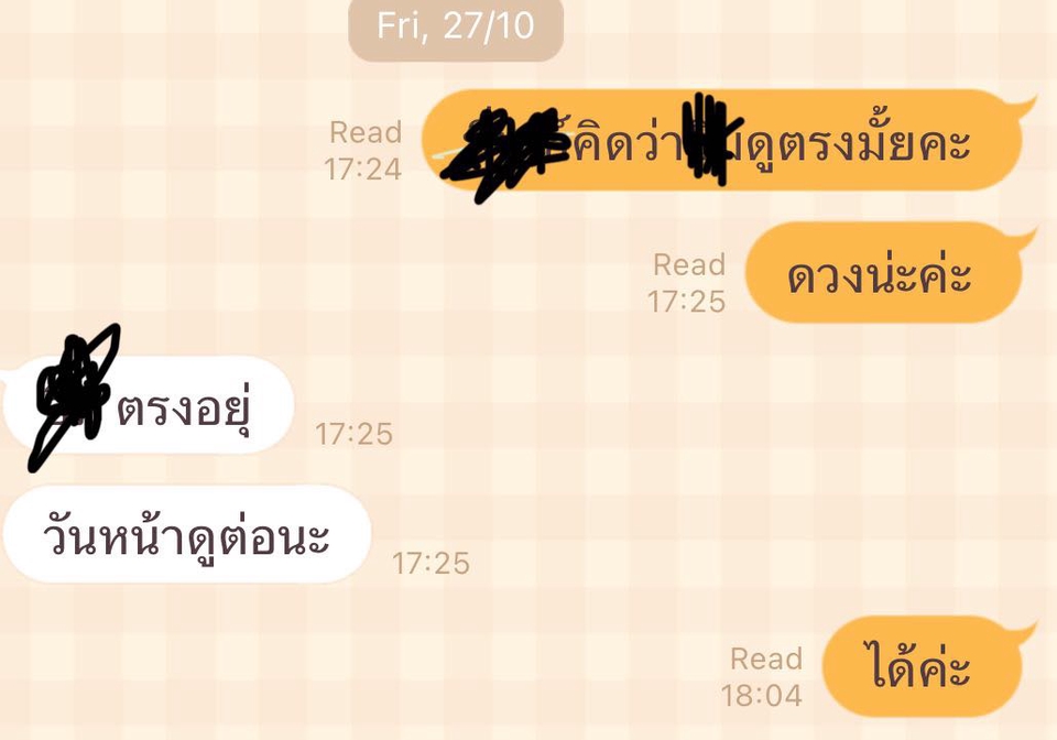 ดูดวงผ่านวิดีโอคอลหรือดูผ่านการพิมพ์โดยใช้ไพ่ทาโร่ต์และออราเคิล รับฟังปัญหาและช่วยหาแนวทางแก้ไขด้วยการเปิดไพ่ สามารถเปิดแบบไพ่แบบ10ใบได้ ไม่รับดูดวงเรืองการเมือง เรื่องชู้(เช่นแย่งคนนั้นได้มั้ยเป็นต้น) ขั้นตอนการทำงาน 1. แจ้งว่าต้องการดูดวงแบบไหน (มีให้เลือกดูแบบทีละคำถามและแบบโทรวิดีโอคอล) 2. แจ้งรายละเอียดว่าสะดวกโทรหรือพิมพ์ พร้อมกับเวลาที่ลูกค้าสะดวกดู(หากมีคิวอยู่แล้วแม่หมอจะแจ้งค่ะ) 3. โอนเงินก่อนดู พร้อมกับให้ไลน์หรือเฟส(กรณีพิมพ์)ที่ลูกค้าอยากจะติดต่อ 4. แจ้งชื่อ ชื่อเล่น อายุของคุณและแม่หมอจะเริ่มทำการสับไพ่ค่ะ