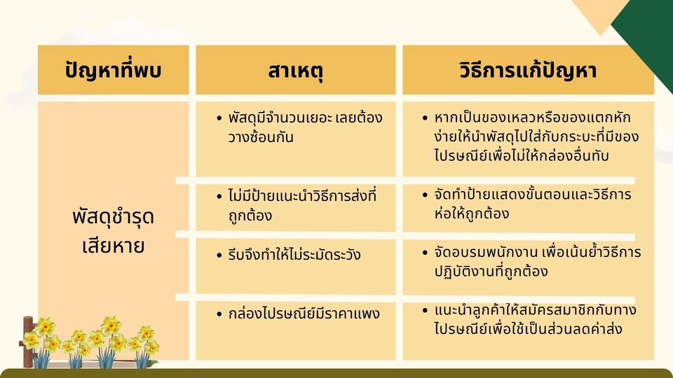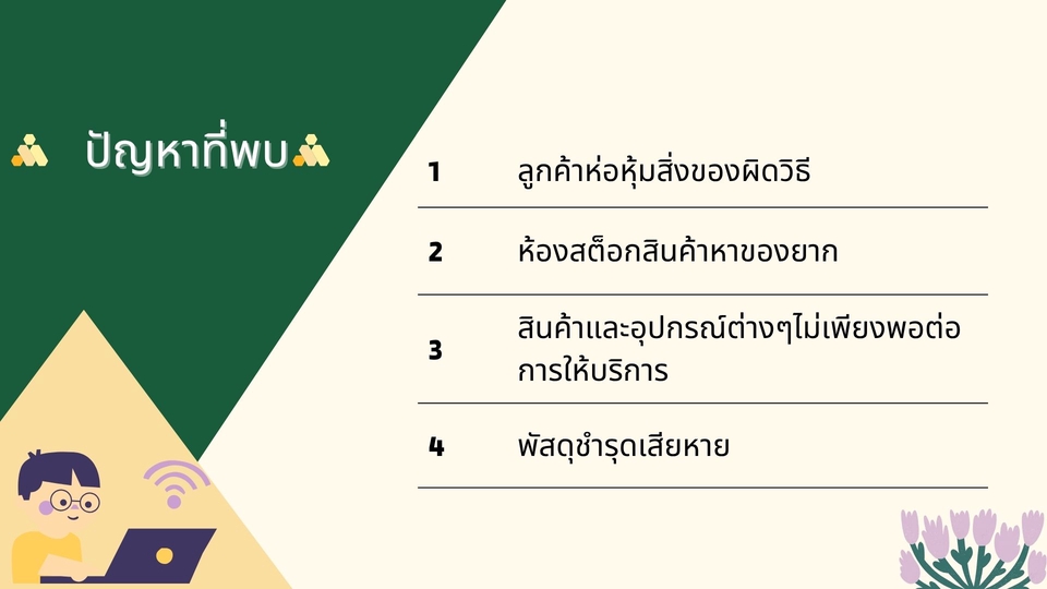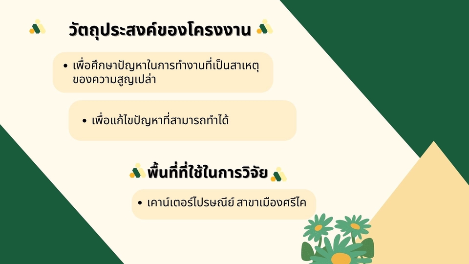 เป็นการทำสไลด์ประกอบงานวิจัยที่อาจารย์เน้นดูง่ายได้ใจความ เป็นการสรุปใจความสำคัญของแต่ละหัวข้อออกมาให้เข้าใจง่าย อ่านง่าย และยังคงความสวยงามอยู่ เนื้อหาครบตามที่กำหนด ขั้นตอนการทำงาน 1. บรีฟงาน 2. ส่งข้อมูล 3. ตกลงกัน 4. ส่งงาน 5. แก้งาน