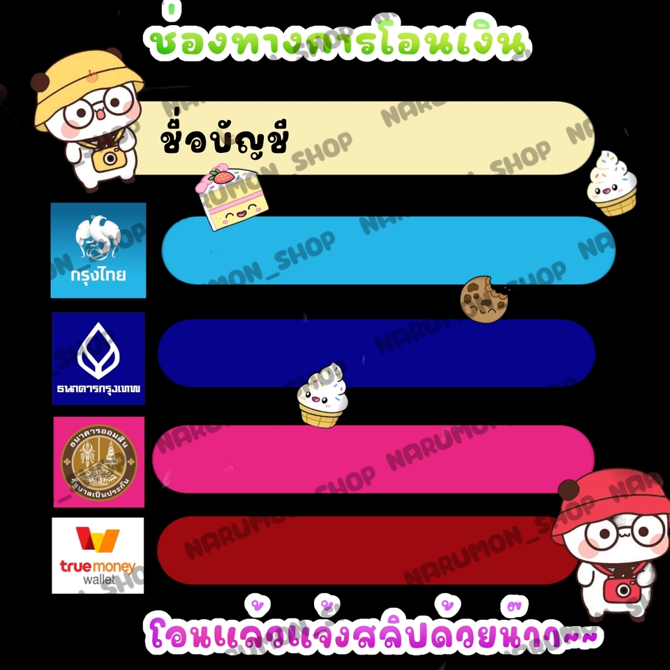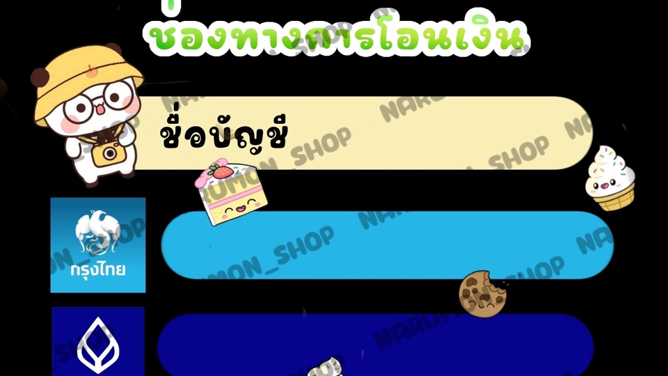 ป้ายสำหรับใส่เลขบัญชีธนาคาร ชื่อผู้โอนเพื่อให้ลูกค้าสะดวกต่อการโอนมาก็ขึ้น สามารถเลือกสีได้ตามต้องการเปลี่ยนธนาคารได้ หรือสามารถแจ้งรูปแบบที่ต้องการได้ตามที่ลูกค้าทุกท่านสนใจ ขั้นตอนการทำงาน 1. ตกลงรายละเอียดกับลูกค้า เพื่อให้ได้รับรายละเอียดตามที่ลูกค้าต้องการ 2. ร่างตัวอย่างให้ลูกค้าดูก่อนจะออกแบบงานจริง 3. ออกแบบงานจริงให้ลูกค้าดูเพื่อให้ลูกค้าตัดสินใจ