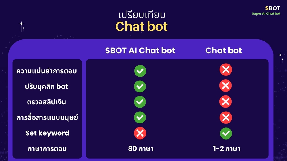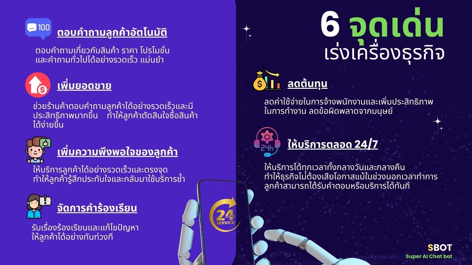 "เอสบอท คือ โรบอทอัจฉริยะ Backup โดย Chat GPT จึงตอบได้เสมือนมนุษย์จริง ช่วยร้านค้าตอบคำถาม ปิดการขาย เพิ่มยอดขาย เข้าใจลูกค้า สร้างความพึงพอใจให้กับลูกค้า ตลอด 24 ชั่วโมง จบงานใน 7 วัน" ** Benefits - ตอบคำถามลูกค้าอัตโนมัติ: ตอบคำถามเกี่ยวกับสินค้า ราคา โปรโมชั่น และคำถามทั่วไป คำถามซ้ำๆ ได้อย่างรวดเร็ว แม่นยำ - ให้บริการตลอด 24/7: ให้บริการได้ทุกเวลาทั้งกลางวันและกลางคืน ทำให้ธุรกิจไม่ต้องเสียโอกาสแม้ในช่วงนอกเวลาทำการ - จัดการคำร้องเรียน: รับเรื่องร้องเรียนและแก้ไขปัญหาให้ลูกค้าได้อย่างทันท่วงที - เช็คสลิปเงิน : Ai สามารถเช็คสลิปเงินแทนคนได้แม่นยำ ลดการทุจริต - เพิ่มยอดขาย: ช่วยให้ร้านค้าสามารถตอบคำถามลูกค้าได้รวดเร็วมีประสิทธิภาพมากขึ้น ทำให้ลูกค้าตัดสินใจซื้อสินค้าได้ง่ายขึ้น - ลดต้นทุน: ลดค่าใช้จ่ายในการจ้างพนักงานและเพิ่มประสิทธิภาพในการทำงาน - เพิ่มความพึงพอใจของลูกค้า: ให้บริการลูกค้าได้อย่างรวดเร็วและตรงจุด ทำให้ลูกค้ารู้สึกประทับใจและกลับมาใช้บริการซ้ำ - เพิ่มประสิทธิภาพในการทำงาน: ช่วยให้เจ้าของร้านค้ามีเวลาในการทำกิจกรรมอื่นๆ มากขึ้น ค่าบริการ ฟรี !! ค่าบริการ Cloud Server ฟรี !! ค่าบริการ จดโดเมน ฟรี !! ติดตั้ง AI บนเซิร์ฟเวอร์ ค่าบริการสั่งสร้าง (ชำระครั้งเดียว) ราคา 7,900.- ค่าบริการดูแล ตรวจสอบระบบ แก้ไขบั๊ก และการอัปเดตซอฟต์แวร์ (รายเดือน) ราคา 2,500.- ขั้นตอนการทำงาน 1. ลูกค้าบรีฟงาน แจ้งความต้องการเกี่ยวกับธุรกิจ บริการ 2. ทางทีมงานประเมินราคา ส่งใบเสนอราคา 3. ทีมงานส่งตัวทดลอง (Demo)ให้ลูกค้า 4. ส่งงานจริง พร้อมติดตั้งบน Cloud