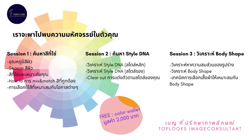 ฿25,000ลูกค้าจะได้รับคำปรึกษาแบบ 1 on 1 ใช้ระยะเวลา 3-4 ชม. โดยอุปกรณ์การวิเคราะห์ที่ได้รับมาตรฐานระดับสากล พร้อมทั้งประสบการณ์สอนกว่า 10 ปีทั้งองค์กรภาครัฐและเอกชน คุณจะได้รับ 1. ภาพลักษณ์ดี โดดเด่น ในแบบฉบับของตัวเอง 2. รู้อุณหภูมิสีผิว/ season สีผิว/ และสีสันที่เหมาะสมกับสีผิวของตัวเอง และเทคนิคการ mix&match สี 3. รู้สไตล์ DNA แต่งตัวได้อย่างมีคาแรกเตอร์ที่ชัดเจนมากขึ้น 4. ค้นพบความสมส่วนของรูปร่าง/ body shape สามารถแต่งตัวเพื่อโชว์จุดเด่นและอำพรางจุดด้อย -ฟรี color wallet สำหรับเทียบสีด้วยตัวเอง-